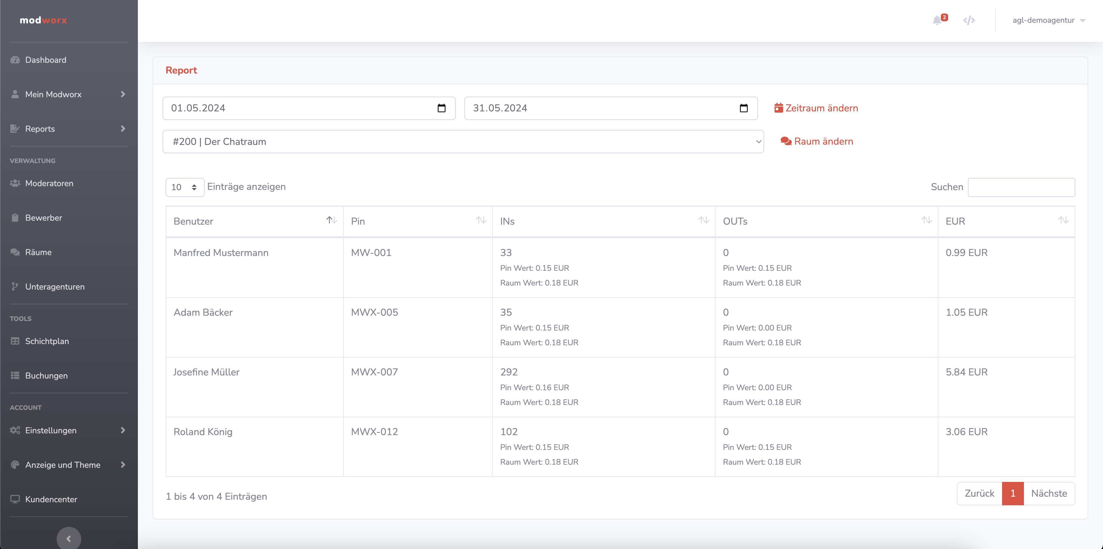 Du möchtest wissen, wie deine Agentur performt? Wer wie viele INs und OUTs schreibt? Mit modworx, der Software für Chatagenturen ist das kein Problem.
